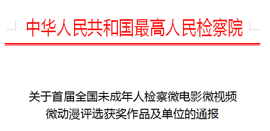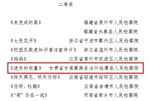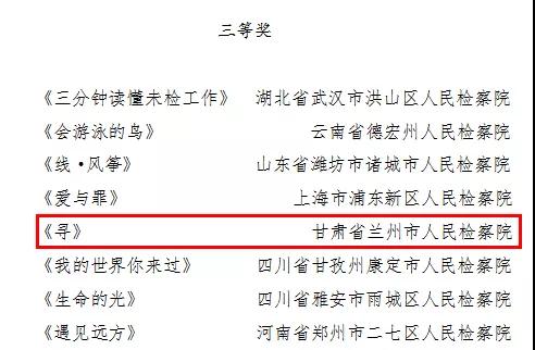 印发了《关于表扬检察机关“法治进校园”全国巡讲活动表现突出单位和突出个人的通报》和《关于首届全国未成年人检察微电影微视频微动漫评选获奖作品及单位的通报》,兰州市检察院、甘南州检察院、景泰县检察院被评为“法治进校园”全国巡讲活动表现突出单位,临潭县检察院原创微电影《迷失的牧童》荣获二等奖,兰州市检察院原创微电影《寻》荣获三等奖。
