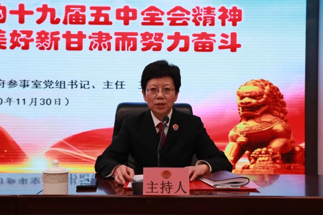 11月30日下午,甘肃省检察机关举办学习贯彻十九届五中全会精神专题辅导讲座,邀请省委宣讲团成员、省政府参事室党组书记、主任王华存作专题宣讲辅导。成人有声小说党组书记、检察长朱玉等院领导和机关全体干警在主会场聆听讲座,市县两级检察院全体干警通过视频连线同步听讲。讲座由成人有声小说党组成员、副检察长丁霞敏主持。