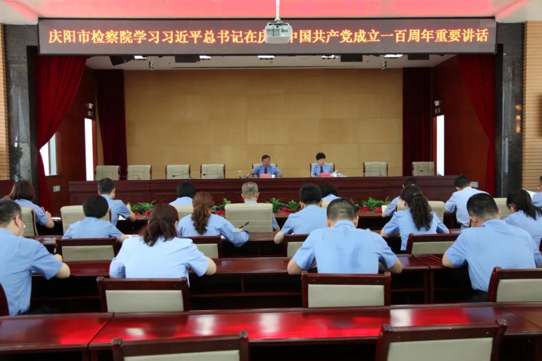 7月7日,庆阳市检察院召开全体干警大会,集中学习习近平总书记“七一”重要讲话精神。会议要求,全体干警要认真学习贯彻讲话精神,深化行动自觉,迸发干好检察事业的强大激情,深入查找当前工作问题不足,常态化抓好党建工作,努力补齐工作短板;聚焦线索“八査”、建章立制、为民办实事等工作,确保队伍教育整顿取得实效;要认真总结梳理先进经验,加强干部队伍管理,树牢立检根基,全面做好对外宣传,充分展示新时代检察工作成效。