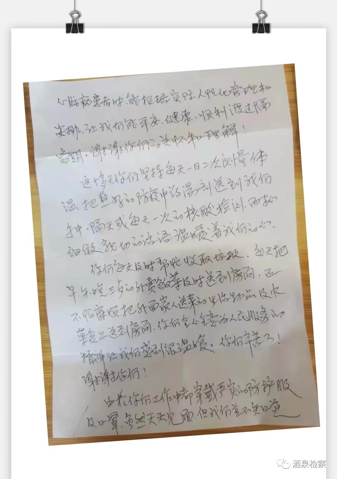 “你们每天及时帮忙收取垃圾,每天把早午晚三餐及时送到房间,还不怕麻烦……”“虽然天天见面,但我不知道你们的名字,也不知道你们的样子,但你们亲切的声音、认真工作的态度都给我们留下了深刻的印象……谢谢你们,辛苦了。”这是酒泉市检察院包抓的一个集中隔离点,隔离人员在解除隔离后致志愿者的感谢信。