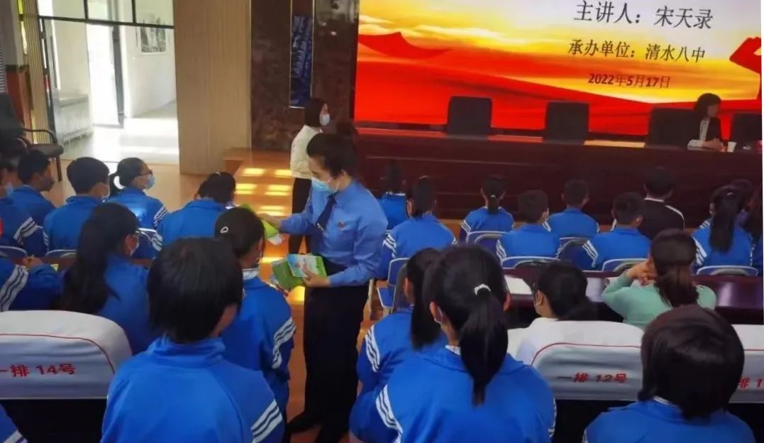 5月17日,清水县检察院检察干警走进清水县第八中学,开展“法治进校园”专题讲座及校园安全检查。课堂上,清水县检察院副检察长、法治副校长宋天录以“行为规范、崇尚法治、遵纪守法”为主题,结合家规、校纪、道德、法律等方面,通过讲解校园欺凌、网络诈骗、性侵害等真实案例,引导在校学生学法、知法、懂法、用法。检察干警们还查看了学校食堂、寝室、教室、保安室等重点区域的管理,帮助排除安全隐患。
