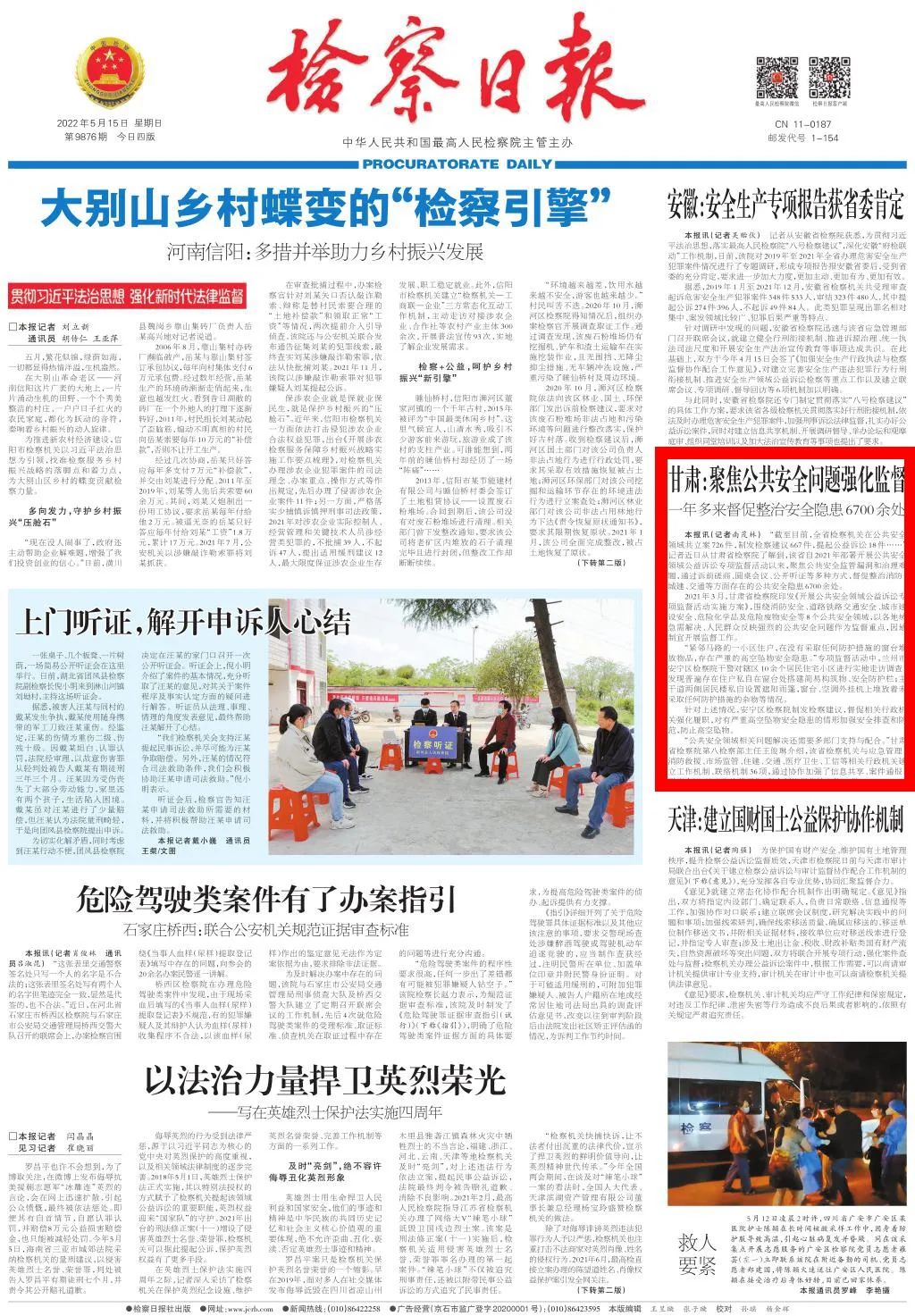 2022年5月15日检察日报头版刊发《甘肃:聚焦公共安全问题强化监督——一年多来督促整治安全隐患6700余处》。