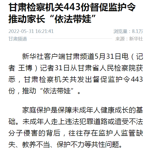 2022年5月31日,新华社客户端发布《甘肃检察机关443份督促监护令推动家长“依法带娃”》。