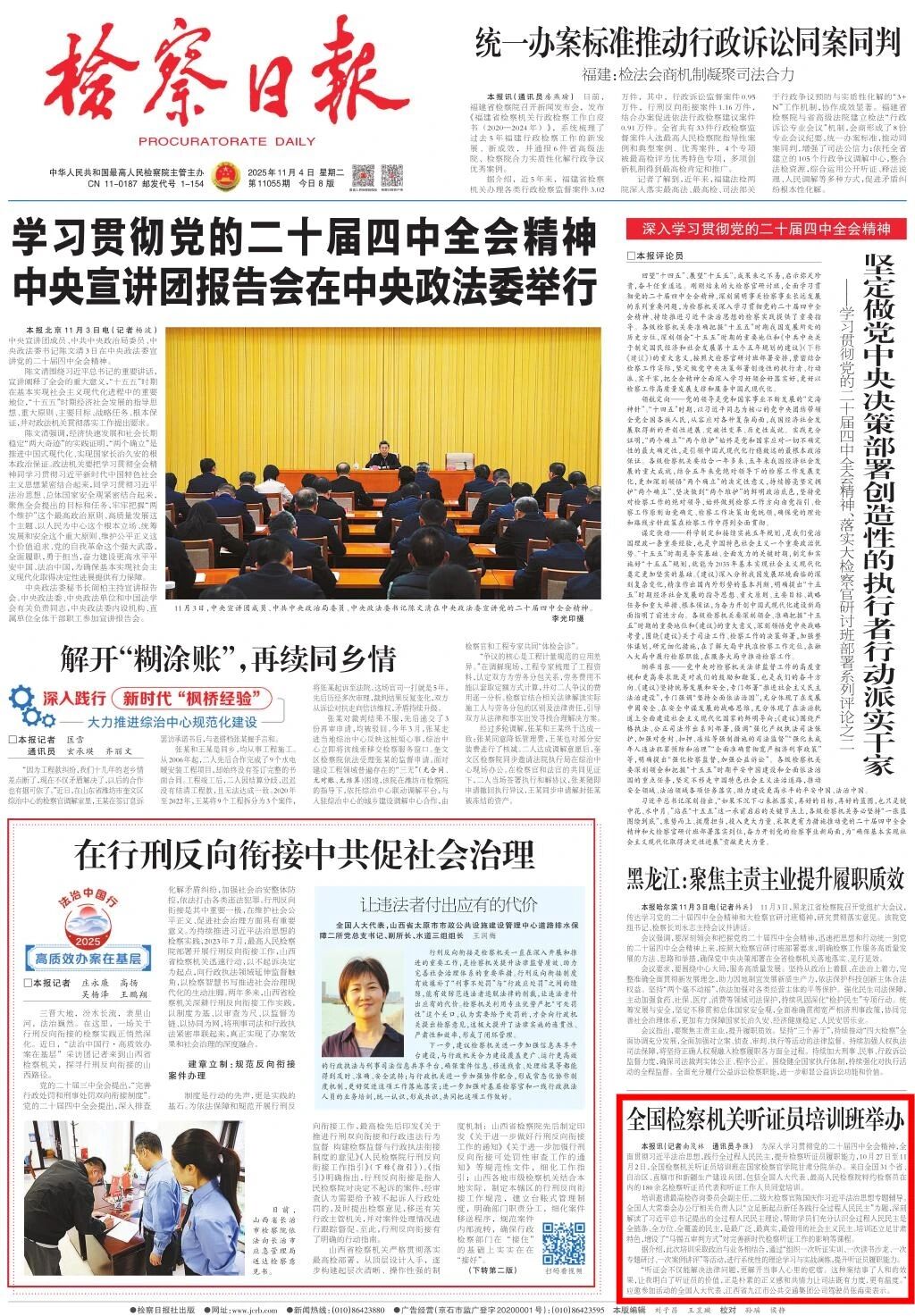 2025年11月4日,检察日报头版刊发《全国检察机关听证员培训班举办》。