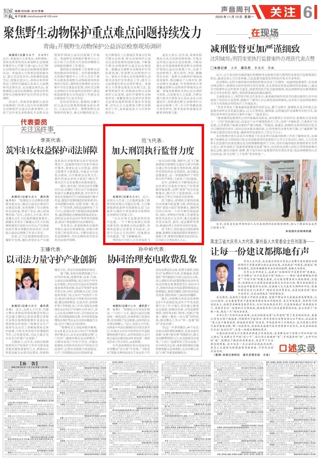 2025年11月10日,检察日报声音周刊刊发《范飞代表:加大刑罚执行监督力度》。
