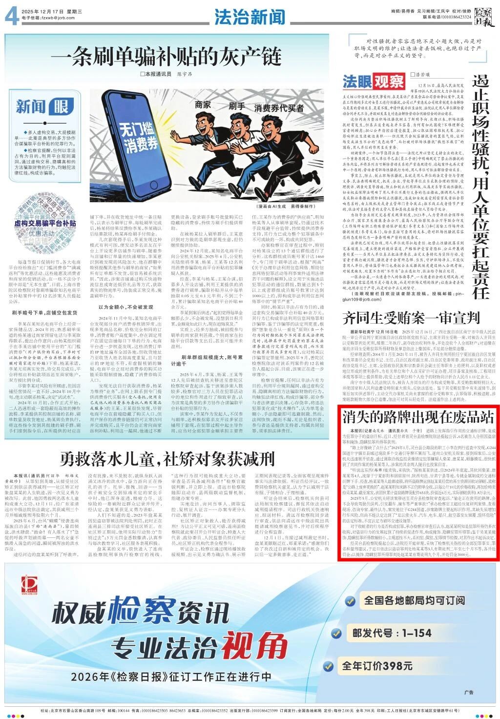 2025年12月17日,检察日报刊发《消失的路牌出现在废品站》。