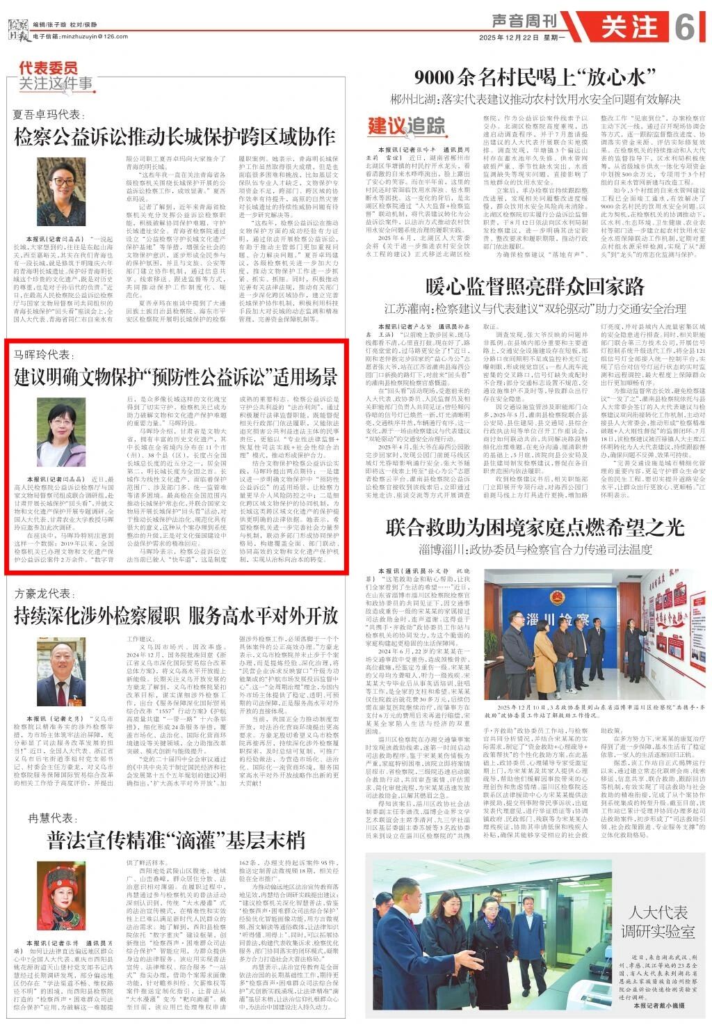 2025年12月22日,检察日报声音周刊刊发《马晖玲代表:建议明确文物保护“预防性公益诉讼”适用场景》。