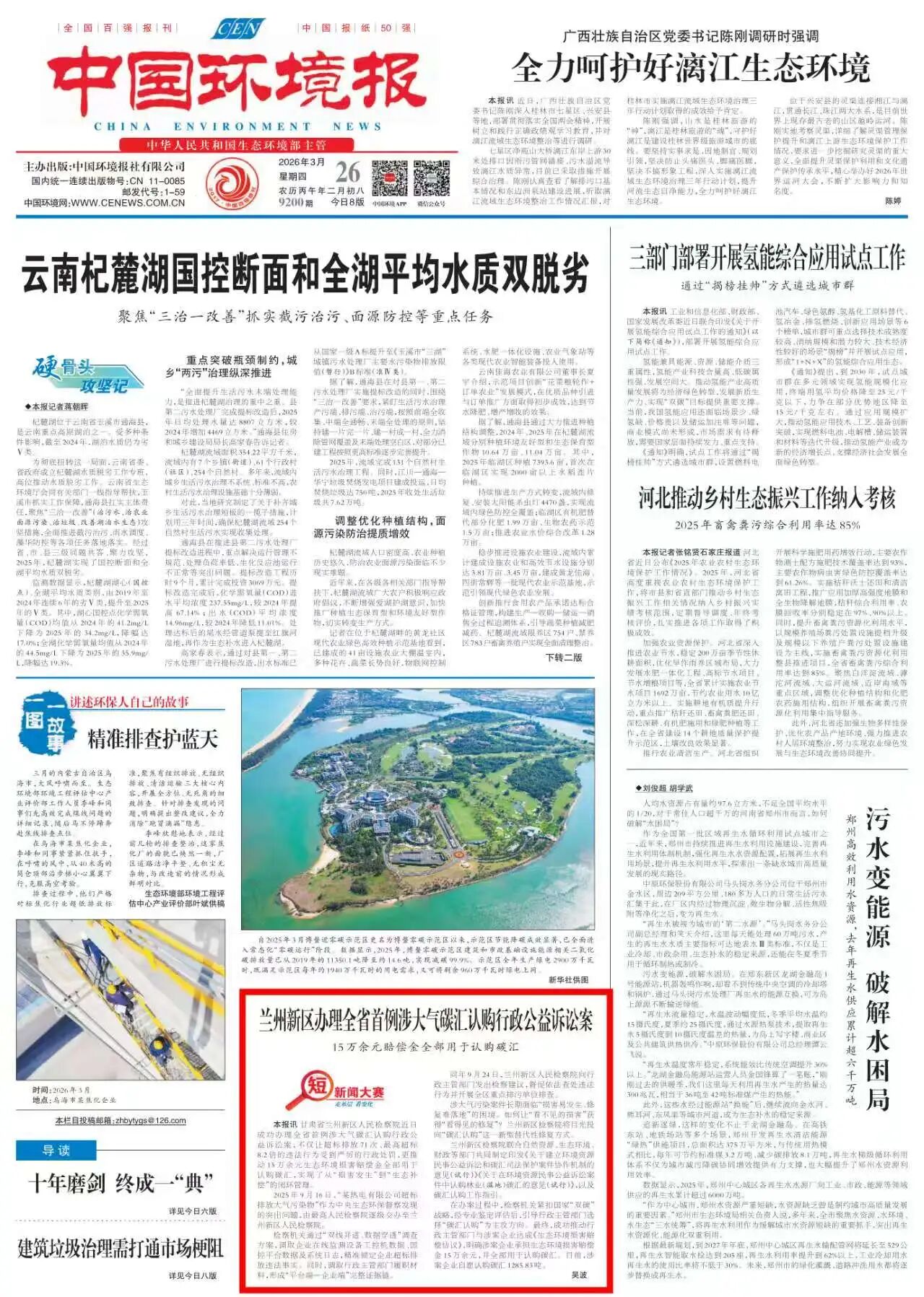 2026年3月26日,中国环境报头版刊发《兰州新区办理全省首例涉大气碳汇认购行政公益诉讼案 15万余元赔偿金全部用于认购碳汇》。
