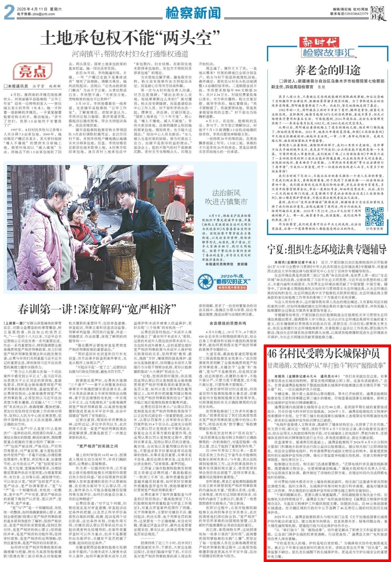 2026年4月11日,检察日报刊发《46名村民受聘为长城保护员 甘肃通渭:文物保护从“单打独斗”转向“握指成拳”》。