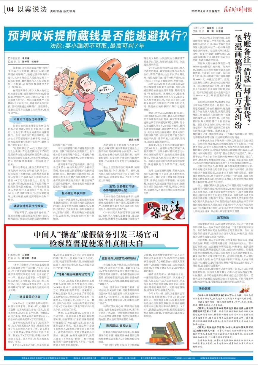 2026年4月17日,民主与法制时报刊发《中间人“操盘”虚假债务引发三场官司 检察监督促使案件真相大白》。