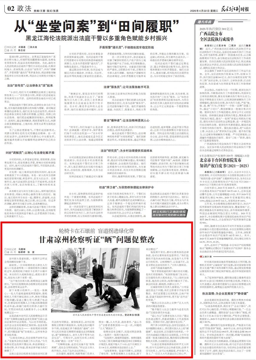 2026年4月22日,民主与法制时报刊发《轮椅卡在石墩前 盲道拐进绿化带 甘肃凉州检察听证“晒”问题促整改》。