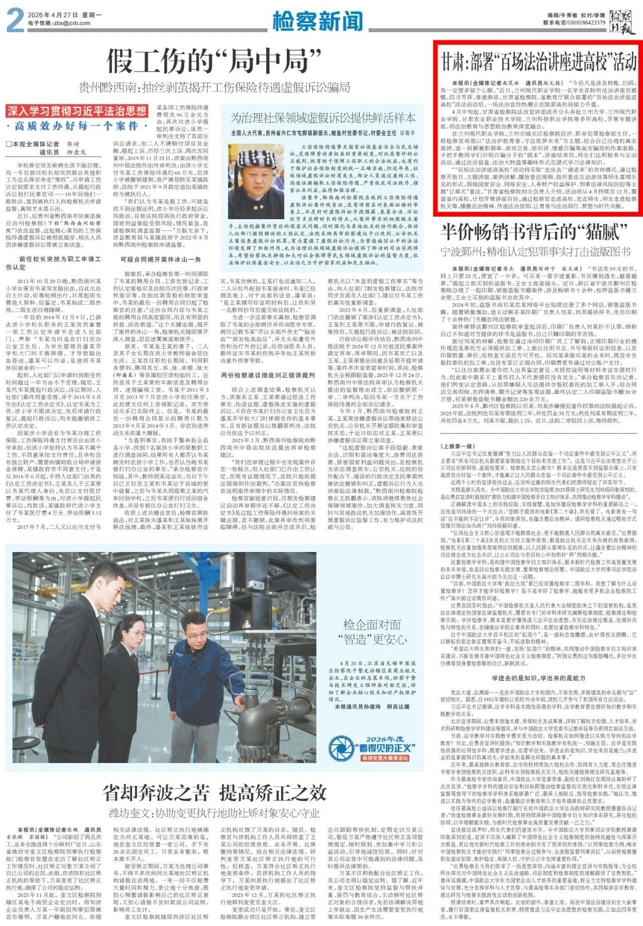 2026年4月27日,检察日报刊发《甘肃:部署“百场法治讲座进高校”活动》。