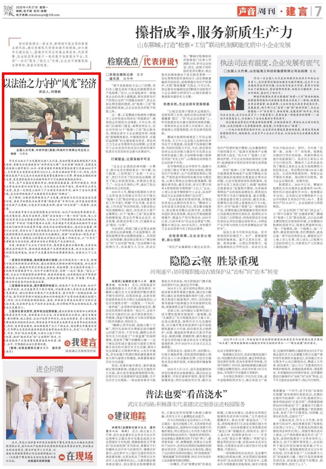 2026年4月27日,检察日报声音周刊刊发《以法治之力守护“风光”经济》。